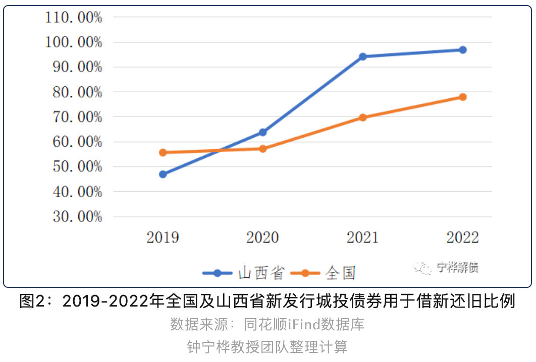 2019年到2022年,山西省新发行的城投债券中,用于借新还旧的比例从46.78%上升至96.76%。全国同期城投债券用于借新还旧的比例从55.51%上升至77.83%。
