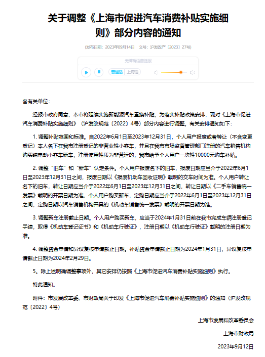 日前,上海市发展和改革委员会、上海市财政局联合发布关于调整《上海市促进汽车消费补贴实施细则》部分内容的通知,经报市政府同意,上海市将延续实施新能源汽车置换补贴。为落实补贴政策安排,对《上海市促进汽车消费补贴实施细则》(沪发改规范〔2022〕4号)部分内容进行调整。