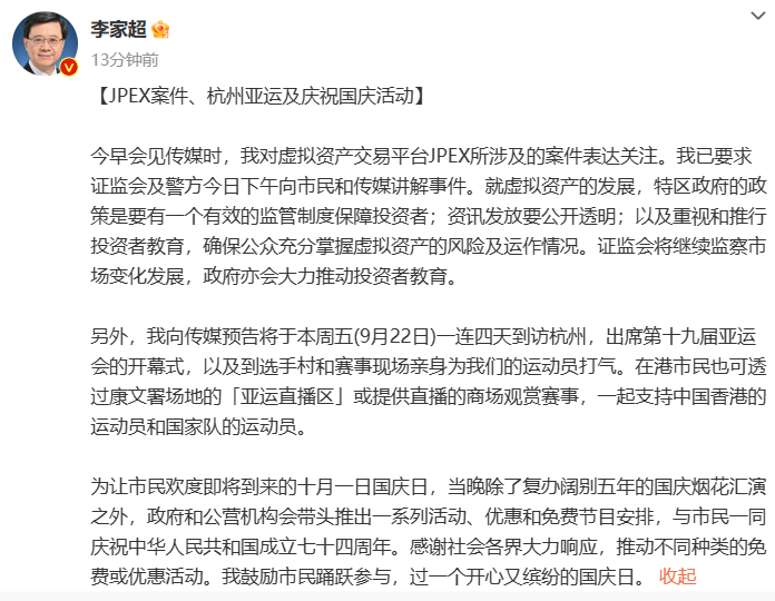9月19日,香港特别行政区行政长官李家超在官微发文称,对虚拟资产交易平台JPEX所涉及的案件表达关注。已要求香港证监会及警方今日下午向市民和传媒讲解事件。