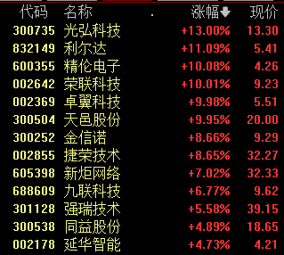 截至午盘,精伦电子、荣联科技、卓翼科技涨停,光弘科技涨超13%。利尔达涨超11%。
