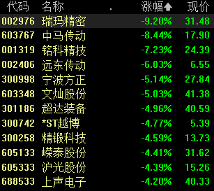 截至午盘,瑞玛精密跌超9%,中马传动跌超8%,宁波方正、文灿股份、沪光股份等跟跌。