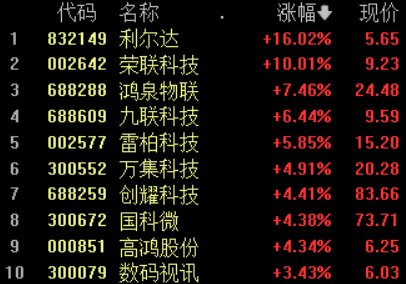 华为产业链逆势走强,星闪概念、华为海思概念等子板块领涨,截至收盘,利尔达涨超16%,荣联科技涨停,鸿泉物联、九联科技、万集科技、创耀科技等纷纷跟涨。