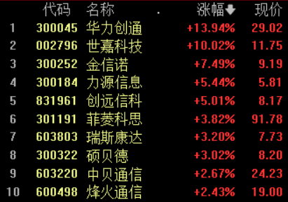 6G概念拉升,截至收盘,华力创通涨近14%,世嘉科技涨停,金信诺涨超7%,力源信息、创远信科涨5%。