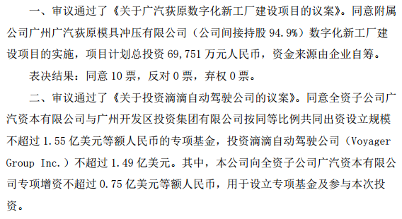 10月12日,广汽集团公告,董事会同意全资子公司广汽资本有限公司与广州开发区投资集团有限公司按同等比例共同出资设立规模不超过1.55亿美元等额人民币的专项基金,投资滴滴自动驾驶公司(Voyager Group Inc.)不超过1.49亿美元。