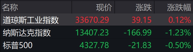 当地时间上周五,美股三大股指涨跌互现。截至收盘,道指涨0.12%,纳指跌1.23%,标普500指数跌0.50%。