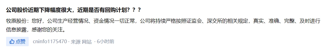 牧原股份表示,本次增持主要是基于对公司未来发展的信心和长期投资价值认可,拟实施增持以支持公司稳定、可持续发展。在增持计划实施期间及法定期限内不减持所持有的公司股份,在增持计划实施完毕后6个月内不减持;不进行内幕交易及短线交易,不在窗口期买卖公司股份。