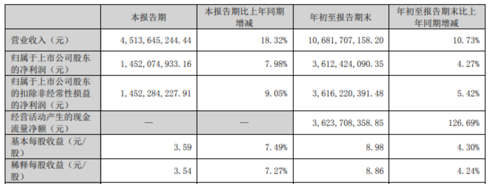 10月23日,长春高新公告,第三季度营收45.14亿元,同比增长18.32%;归属于上市公司股东的净利润14.52亿元,同比增长7.98%。