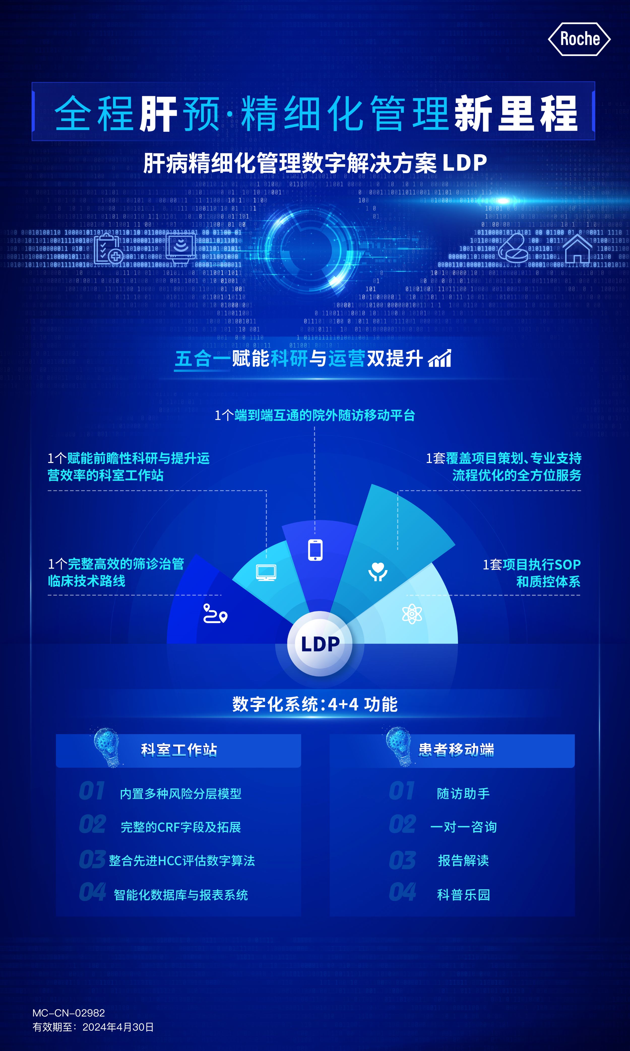 罗氏集团肝癌筛诊治管全病程管理数字解决方案包括肝病精细化管理数字解决方案和肿瘤全病程管理数字化解决方案,通过完整、高效的临床技术路线,赋能科室工作站进行前瞻性科研和提升运营效率,实现端到端互通的院外随访移动平台,以五合一赋能科研与运营双提升,并通过由多学科会诊模块、随访模块、数据库及分析模块构成的“三位一体”推动肿瘤综合诊治发展。