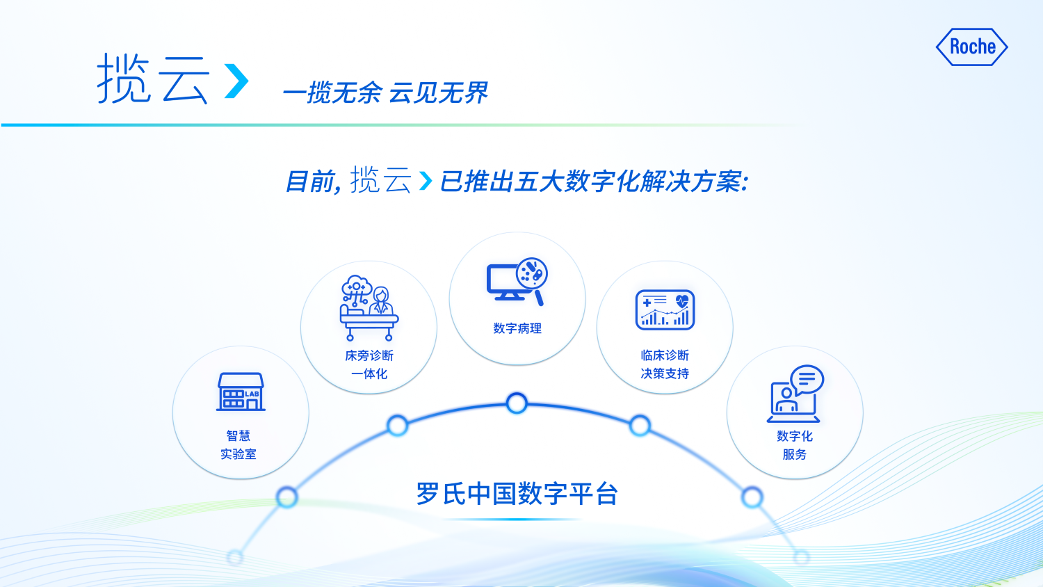 其中,罗氏诊断中国数字化创新解决方案——揽云,围绕“革新医学检验数字化”、“洞察医患决策智能化”、“共建医疗生态个性化”三大战略,展示了智慧实验室、床旁诊断一体化、数字病理、临床诊断决策支持、数字化服务五大解决方案。