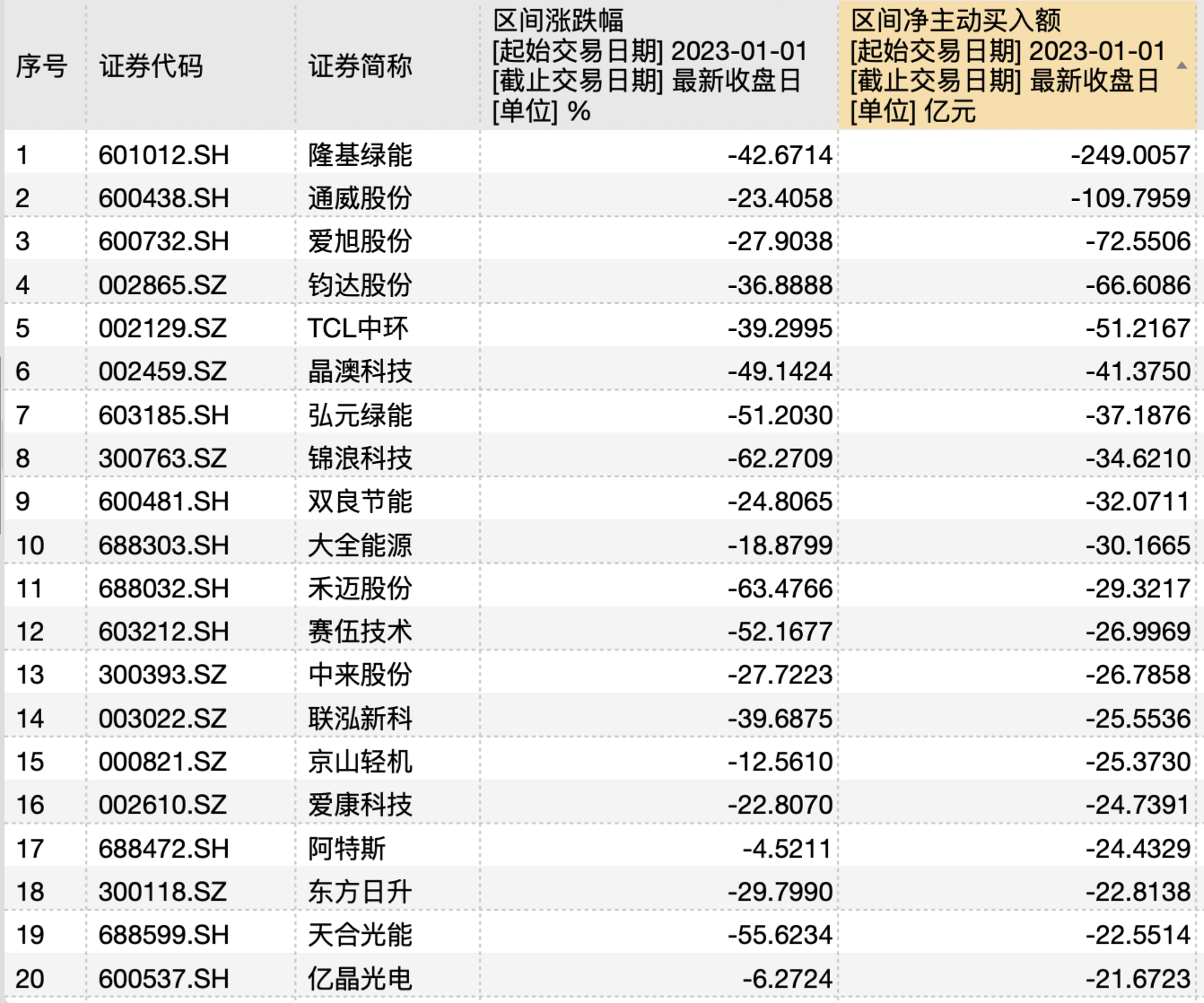 今年年内,共有55只个股遭主力资金净卖出。数据显示,隆基绿能、通威股份分别遭抛售249亿元、109.79亿元,爱旭股份、钧达股份、TCL中环、晶澳科技等遭减仓额度居前。