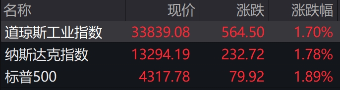 当地时间周四,美股三大股指全线收涨,道指涨1.70%,标普500指数涨1.89%,纳指涨1.78%。