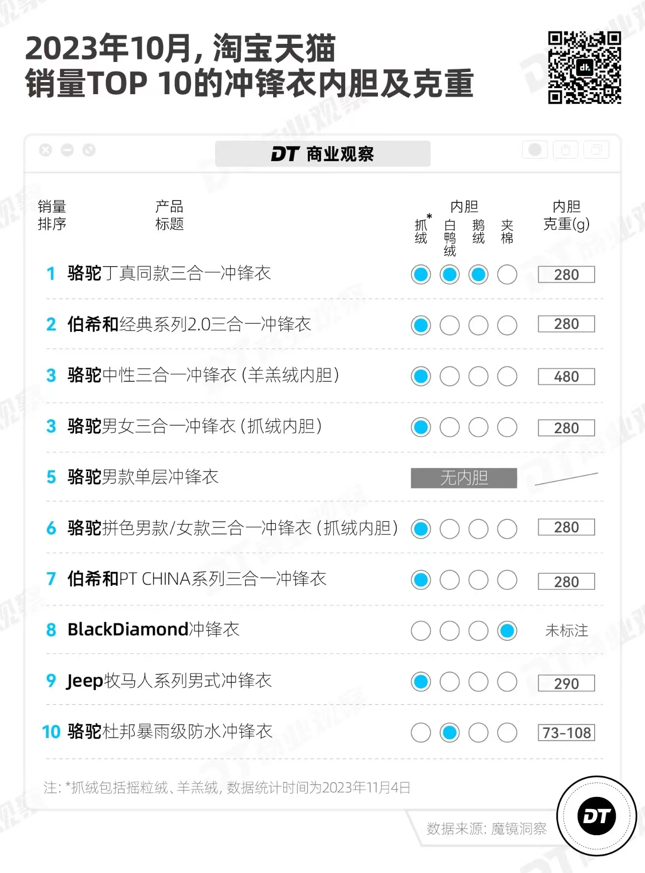 根据魔镜洞察的数据,今年1月-10月,淘宝天猫卖出的冲锋衣中,超过7成都是“三合一”款式。