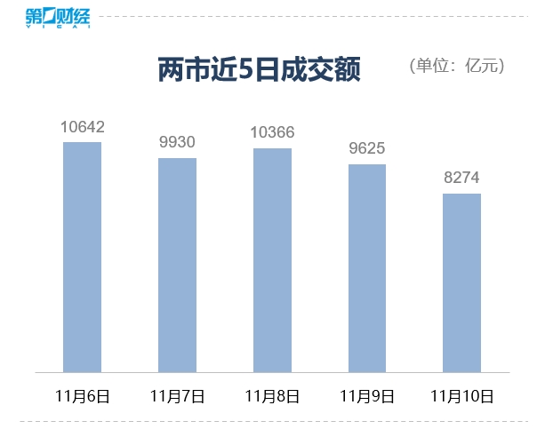 11月10日, 三大指数集体收跌,截至收盘,沪指跌0.47%,深证成指跌0.53%,创业板指跌0.65%。