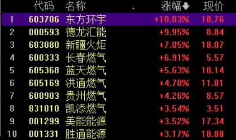 燃气股异动,东方环宇、德龙汇能涨停,蓝天然气、长春燃气等跟涨。