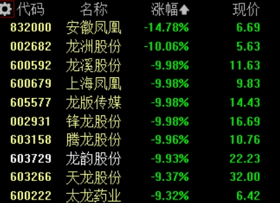 龙字辈”“凤字辈”个股大跌,安徽凤凰大跌14%,锋龙股份、龙洲股份、上海凤凰、龙版传媒、龙溪股份、腾龙股份等多股跌停。