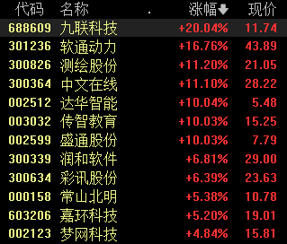 鸿蒙概念股涨幅居前,截至午盘,九联科技、达华智能、传智教育、盛通股份涨停,中文在线、润和软件、彩讯股份等跟涨。