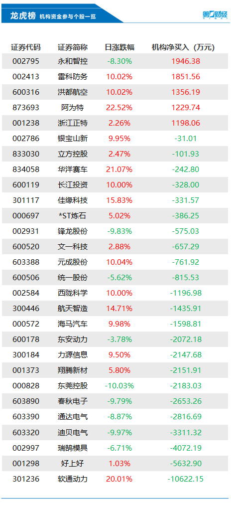 当天机构净买入前三的股票分别是永和智控、雷科防务、洪都航空,净买入金额分别是1946万元、1852万元、1356万元。