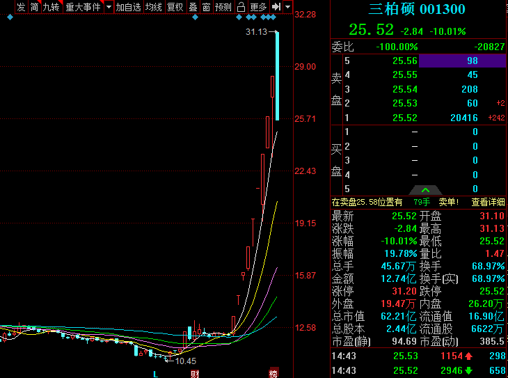 11月23日,三柏硕高开,一度接近涨停价,随后回落,截至发稿,股价跌停,报25.52元,成交额超12亿元。该股此前录得9连板。