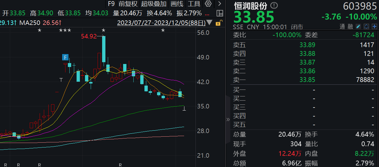 盘面上,截至今日收盘,恒润股份跌停,报33.85元。
