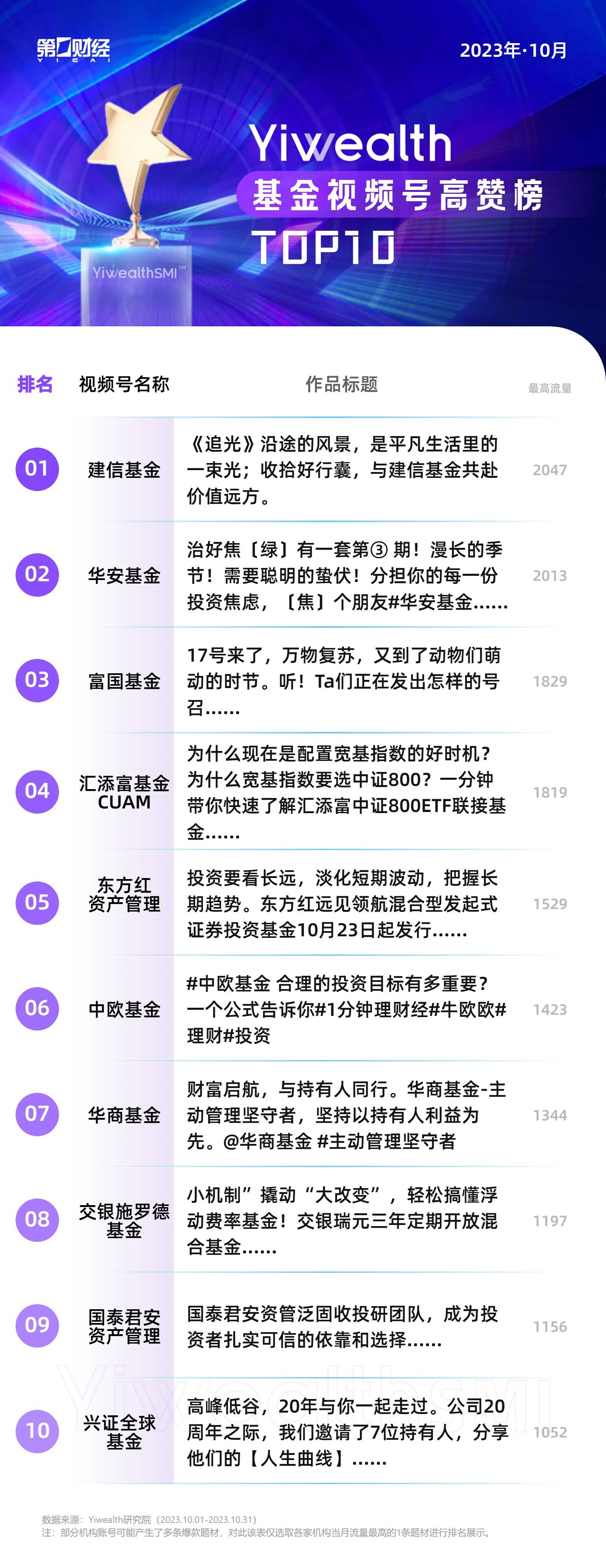 视频号方面,建信基金和华安基金揽获高赞榜前二,建信基金以“追光”为主题介绍了生活中的各种投资,华安基金则关注用户在投资过程中产生的焦虑情绪并提出应对措施,获得广泛共鸣。总的来看,上榜作品以品宣内容为主。