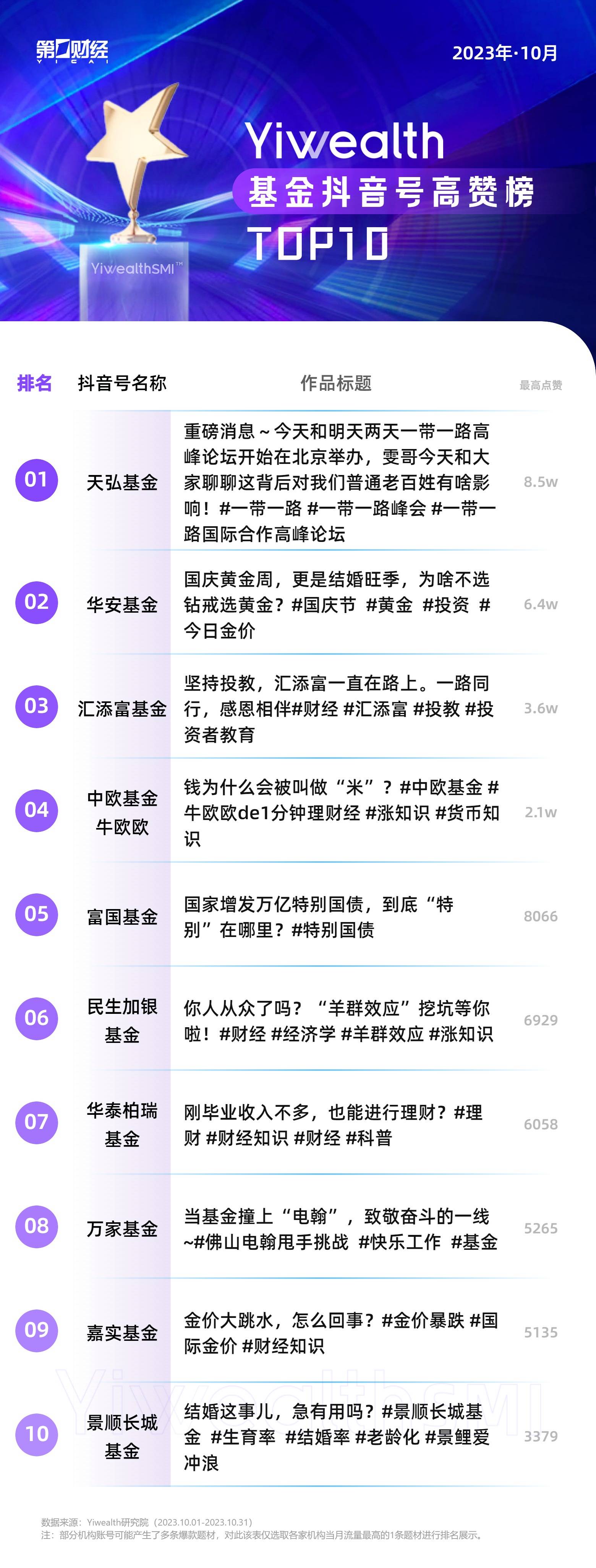 在抖音平台,知识科普内容占据了人气题材半壁江山,比如国债、羊群效应、黄金价格等等。排在第一位的天弘基金《重磅消息!今天和明天两天一带一路高峰论坛开始在北京举办,雯哥今天和大家聊聊这背后对我们普通老百姓有啥影响!》解读一带一路对普通人的影响,视频获赞8.5w;华安基金则是借国庆结婚的热度,解读黄金投资,收获6.4w赞。