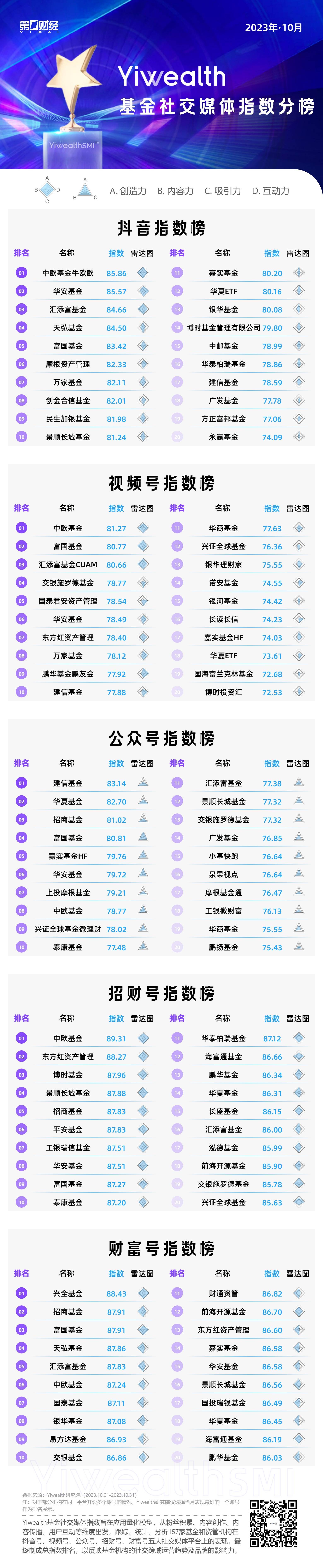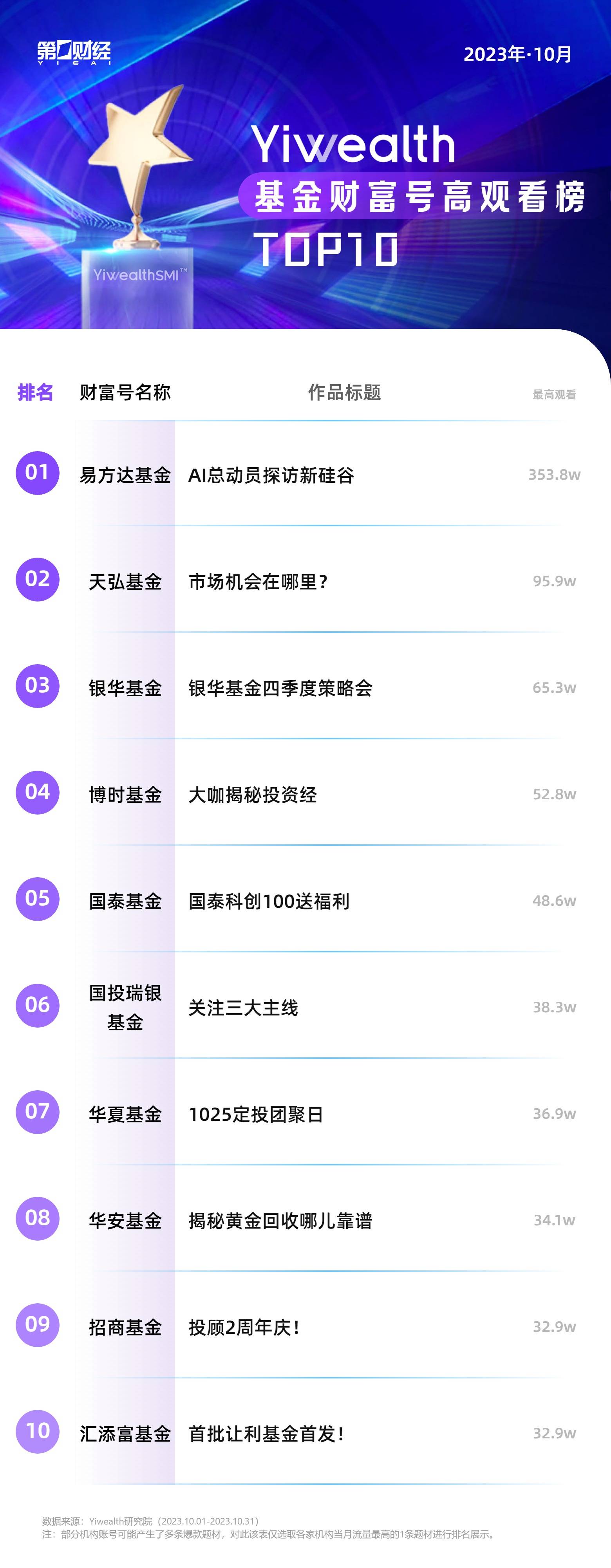 相较于9月,新入总榜的机构有长城基金和东方红资管,分别排名第十三和第十七。值得注意的是,华安基金超过汇添富基金,与中欧基金、富国基金共同占据总榜前三。10月,各大平台高流量主题聚焦于投资热点与宏观政策。