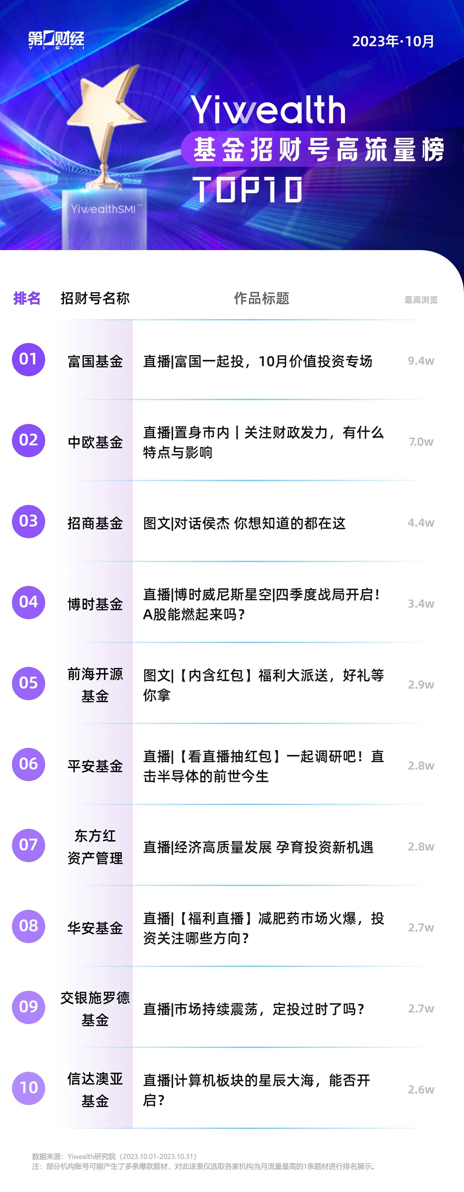 招财号高流量作品以直播为主,其中富国基金表现卓越,凭借“10月价值投资专场”主题直播斩获招财号高浏览榜榜单第一位,获得9w+场观。从主题方面来看,排名前位的作品大多聚焦于生活中的投资机遇以及国家经济政策对市场的影响。