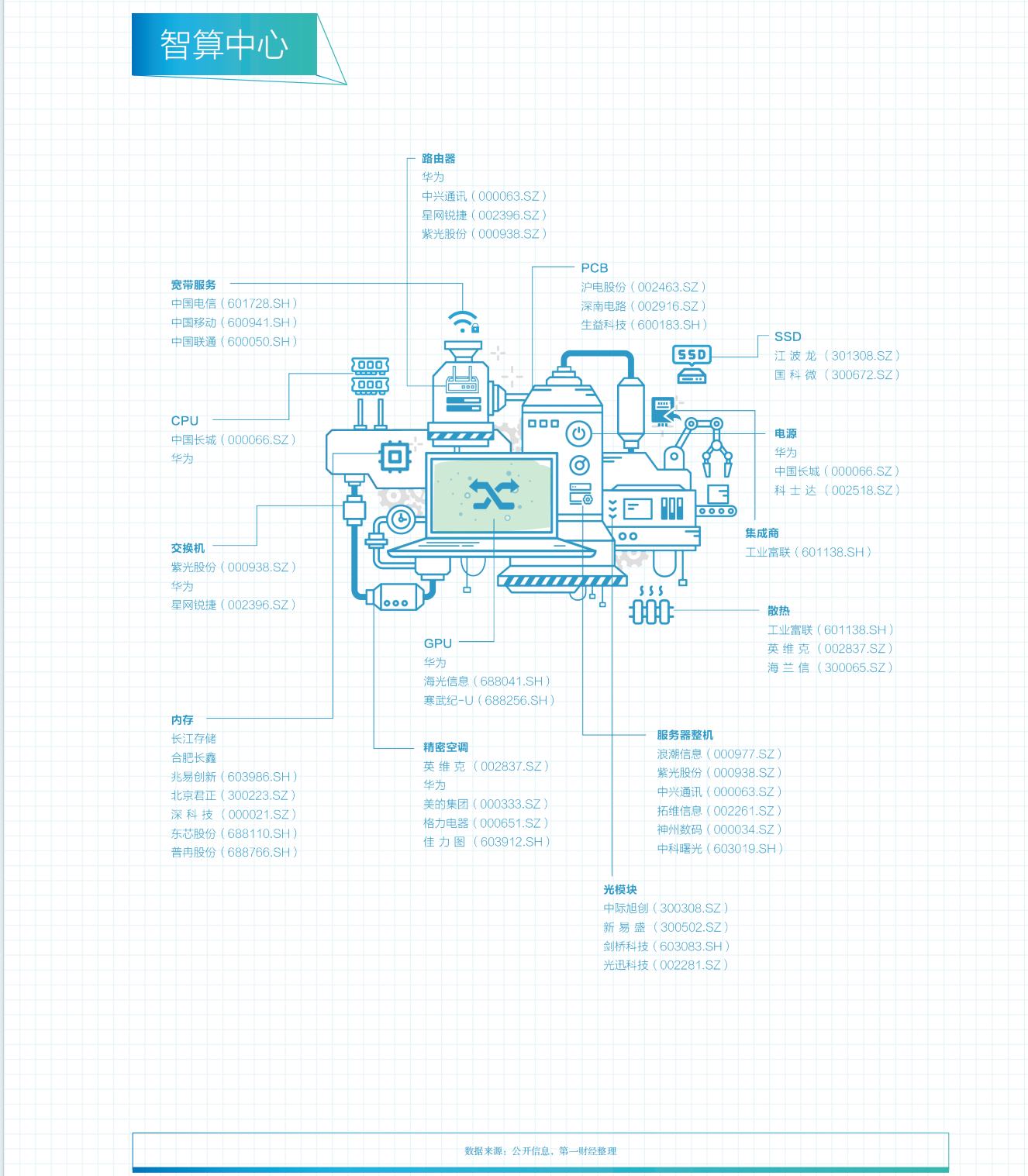 AI技术的快速发展推动我国对算力需求急速增长,作为算力网络重要支点,智算中心的建设工作已在各地如火如荼地展开,国内产业链企业将如何把握这一重大机遇?2023年12月13日正式对外发布的第一财经《2023年科创产业图谱》中,深度解构我国智算中心产业链,在宽带服务、PCB、SSD、整机服务到散热设备的产业链各个关键细分环节中寻找并记录最有代表性企业,以最直观的形势呈现给广大读者。