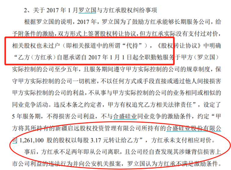 其中,2017年,罗立国为了鼓励方红承能够长期服务公司,给予附条件的激励,双方形式上签署股权转让协议,但方红承实际没有支付过对价,相关股权也未过户(即所谓的“代持”)。