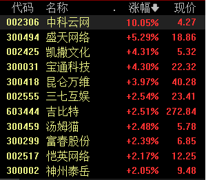12月19日,游戏板块盘中大幅拉升,截至发稿,中科云网涨停,盛天网络涨超5%,凯撒文化、宝通科技、昆仑万维等跟涨。