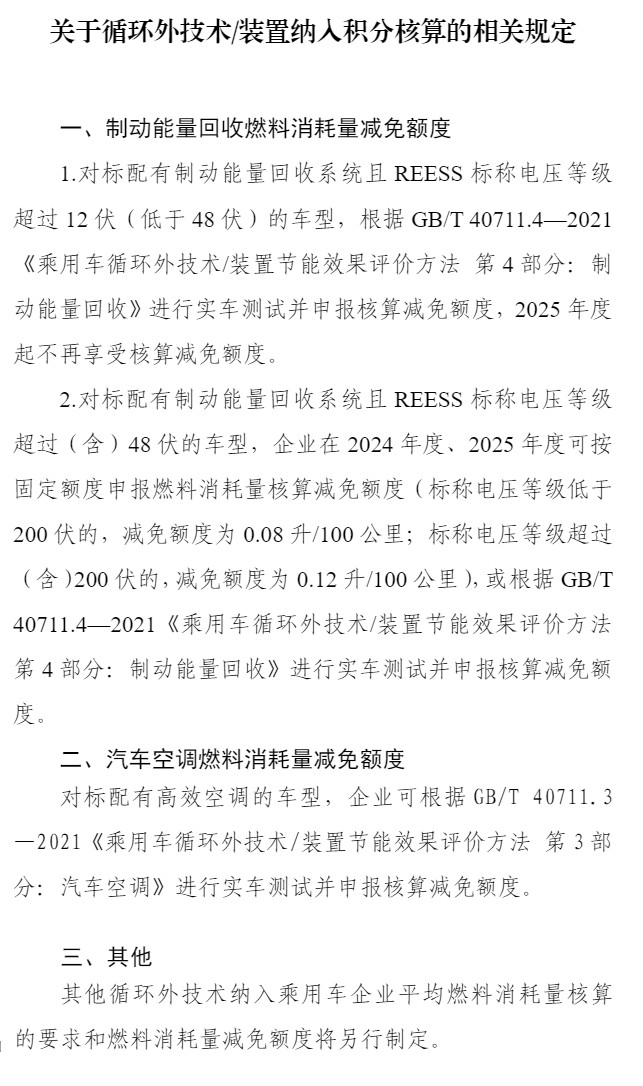 四、在企业平均燃料消耗量积分核算中,对标准配置制动能量回收系统、高效空调等循环外技术/装置且具有循环外节能效果的车型,其燃料消耗量可相应减免一定额度(可累加)。企业可按附件规定进行申报。