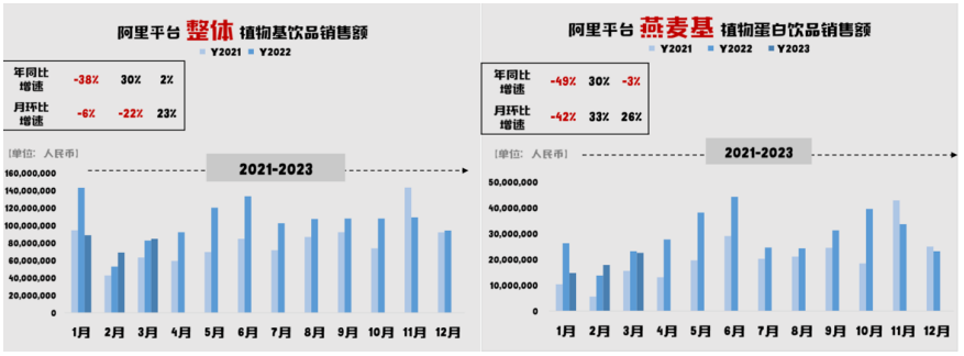 2021-2023 年阿里平台植物基饮品与燕麦奶销售额(数据来源:阿里平台数据库,2021 年 1 月-2023 年 3 月, 2023)