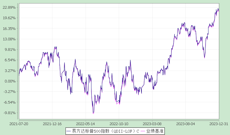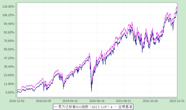 报告显示,易方达标普500指数(QDII-LOF)2023年四季度净值收益率,业绩比较基准个百分点,以下为其成立以来净值收益率与同期业绩比较基准(标普500指数收益率(使用估值汇率折算)×95%+活期存款利率(税后)×5%)的走势对比:
