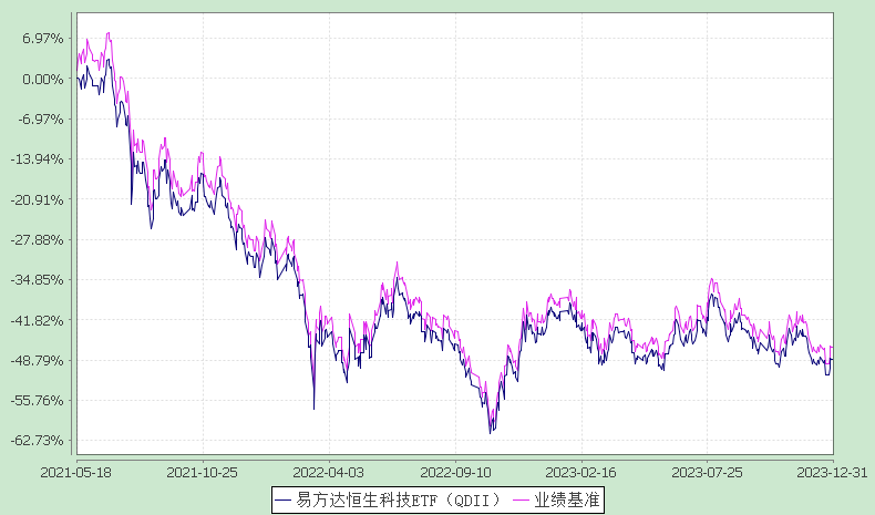 报告显示,易方达恒生科技ETF(QDII)2023年四季度净值收益率,业绩比较基准个百分点,以下为其成立以来净值收益率与同期业绩比较基准(恒生科技指数收益率(使用估值汇率折算))的走势对比: