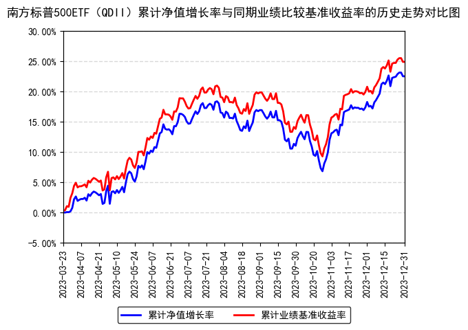 报告显示,南方标普500ETF(QDII)2023年四季度净值收益率,业绩比较基准个百分点,以下为其成立以来净值收益率与同期业绩比较基准(本基金的业绩比较基准为经汇率调整后的标的指数收益率。本基金标的指数为标普500指数,及其未来可能发生的变更。)的走势对比:
