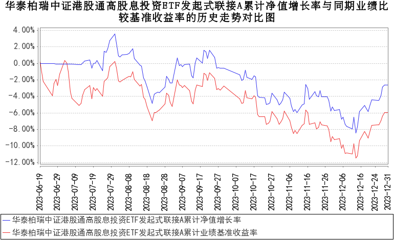 报告显示,华泰柏瑞中证港股通高股息投资ETF发起式联接A(018387.OF)/C2023年四季度净值收益率,业绩比较基准个百分点,以下为其成立以来净值收益率与同期业绩比较基准(中证港股通高股息投资指数收益率×95%+银行活期存款利率(税后)×5%)的走势对比: