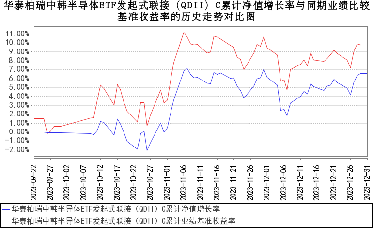 报告显示,华泰柏瑞中韩半导体ETF发起式联接(QDII)A/C2023年四季度净值收益率,业绩比较基准个百分点,以下为其成立以来净值收益率与同期业绩比较基准(中证韩交所中韩半导体指数收益率×95%+银行活期存款利率(税后)×5%)的走势对比: