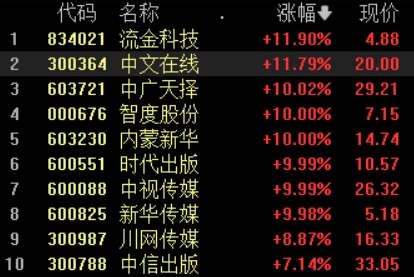 1月31日,传媒板块盘中逆市拉升,截至发稿,中视传媒连续7个交易日涨停,中广天择、时代出版、新华传媒等多股涨停,流金科技、中文在线涨超11%。