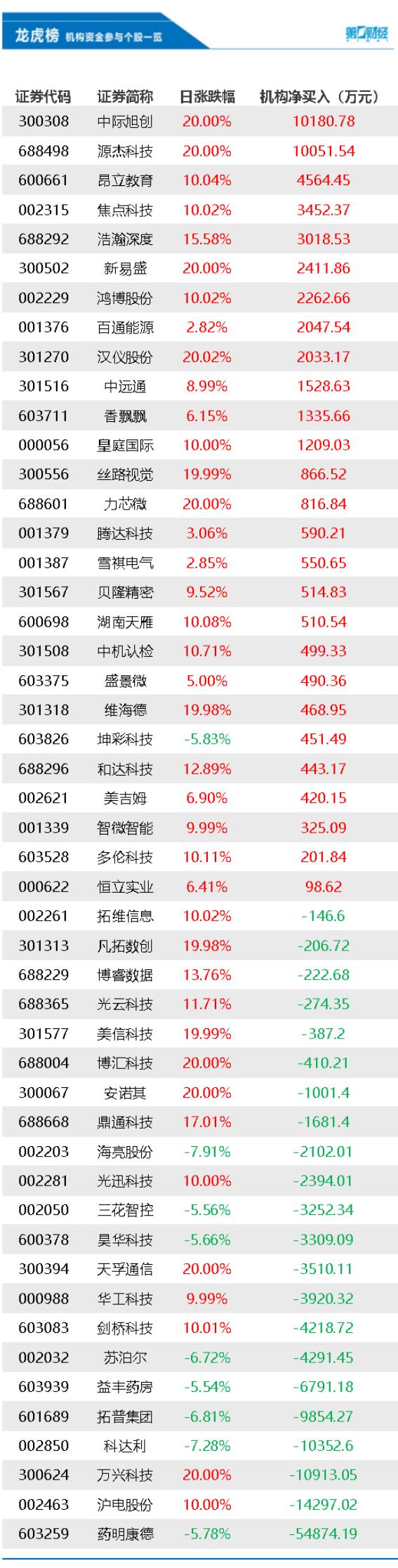 盘后数据显示,2月19日龙虎榜中,共49只个股出现了机构的身影,有27只股票呈现机构净买入,22只股票呈现机构净卖出。当天机构净买入前三的股票分别是中际旭创、源杰科技、昂立教育。当天机构净卖出前三的股票分别是药明康德、沪电股份、万兴科技。