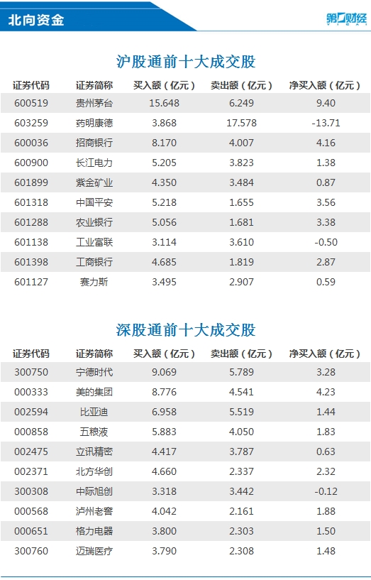 2月19日,北向资金全天净卖出63.72亿元;其中沪股通净买入1.80亿元,深股通净卖出65.53亿元。前十大成交股中,净买入额居前三的是贵州茅台、美的集团、招商银行。净卖出额居前三的是药明康德、工业富联、中际旭创。