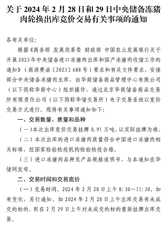 2月27日,华储网发布关于2024年2月28日和29日中央储备冻猪肉轮换出库竞价交易有关事项的通知,本次出库竞价交易挂牌0.91万吨。