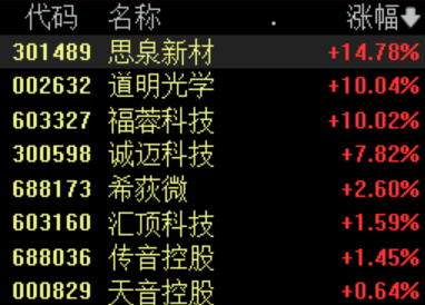 3月5日早盘,AI手机概念股表现活跃,截至发稿,福蓉科技4连板,道明光学涨停,思泉新材涨超14%,希荻微、诚迈科技涨幅靠前。
