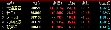 景点及旅游板块表现活跃,大连圣亚、长白山涨停,天目湖、张家界等涨超5%。