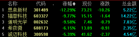 AI 手机概念回调,思泉新材跌超12%,福蓉科技、道明光学等跌超9%。