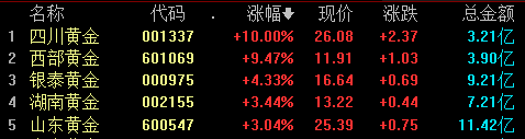 具体来看,贵金属板块走高,四川黄金涨停,西部黄金、银泰黄金、山东黄金等涨幅居前。