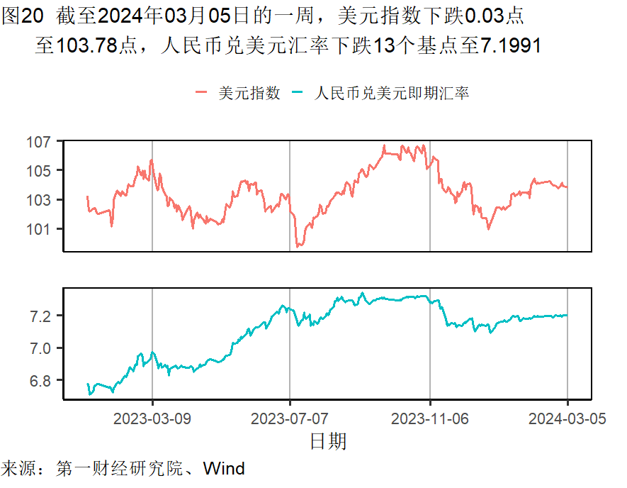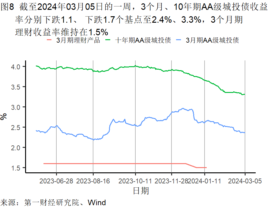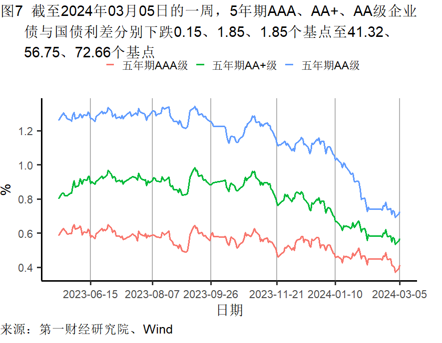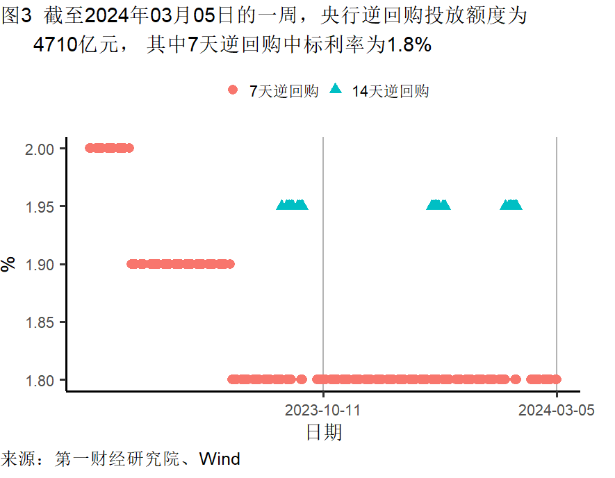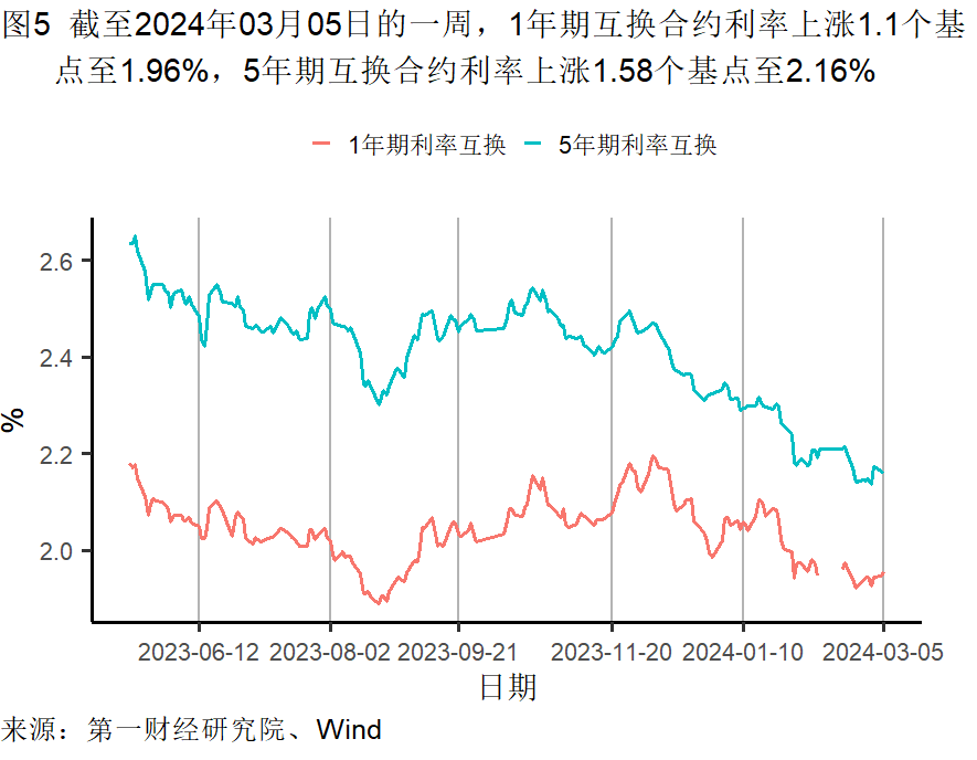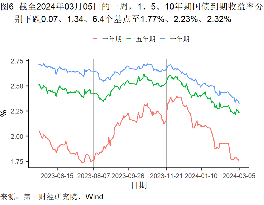 截至3月5日的一周,央行通过公开市场净回笼资金5960亿元。银行间隔夜利率在截至3月5日的一周下降了7个基点,过去一个月上升了8个基点,较去年同期上升了51个基点。七天回购利率在过去一周下降了11个基点,过去一个月上升了11个基点,较去年同期上升了4个基点。