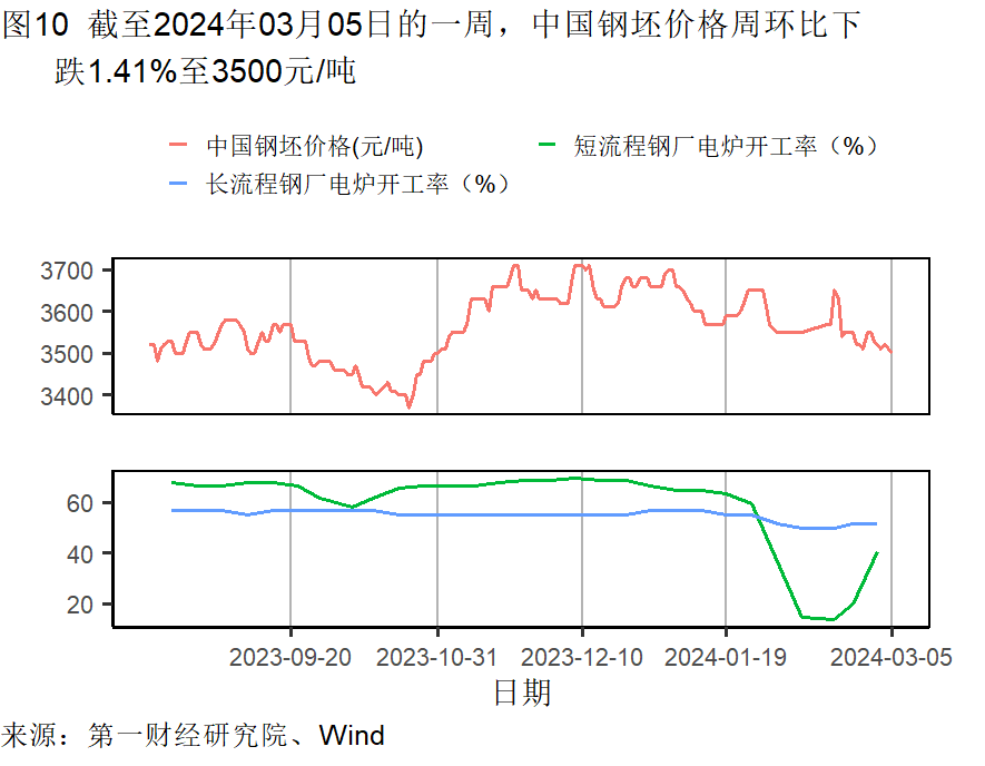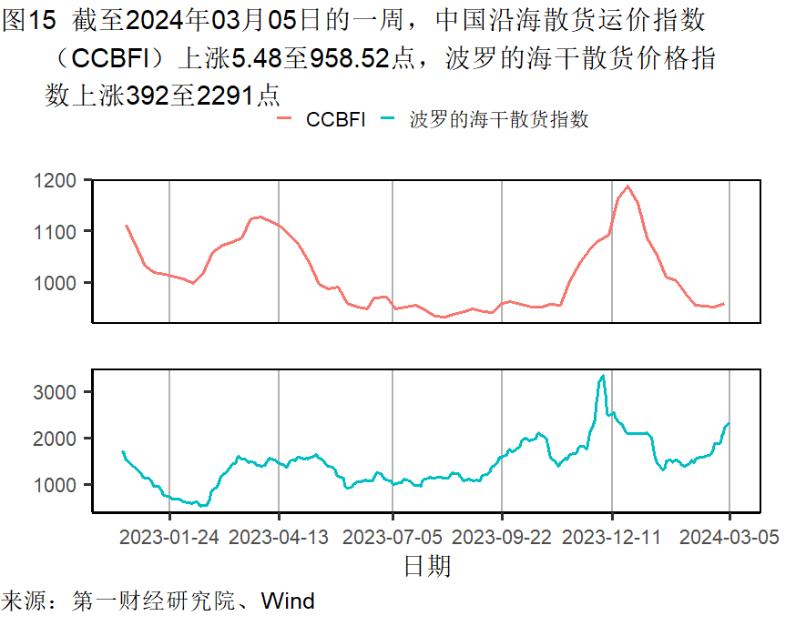 本周钢坯价格回落,在截至3月5日的一周下降了1.41%,过去一个月下降了1.41%,较去年同期下降了12.28%。水泥价格继续走高,在截至3月5日的一周上升了0.05%,过去一个月下降了0.37%,较去年同期下降了22.48%。动力煤价格较去年同期下降了0.54%。