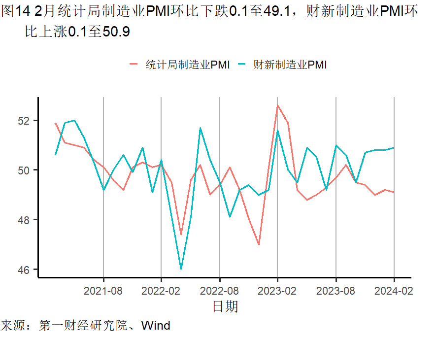 国家统计局公布2月采购经理人指数。2月,制造业PMI为49.1%,较上月下降0.1个百分点,已连续五个月处于荣枯线以下。分企业规模来看,大、中、小型制造业企业景气水平有所分化:大型企业PMI与上月一致(50.4%);中型企业景气水平有改善的迹象,已连续两个月上升;小型制造业PMI则延续下降走势,较上月下降了0.8个百分点至46.4%。