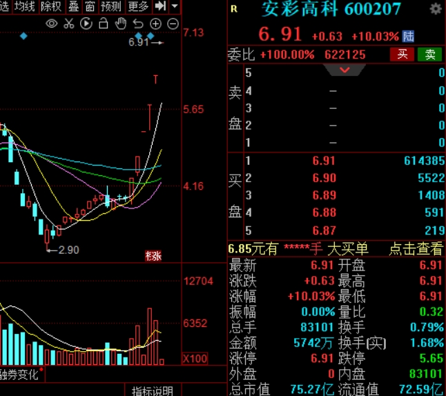 安彩高科开盘涨停,截至午间收盘,股价报6.91元,该股已录得六连板。