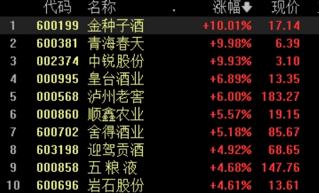 白酒板块持续走强,金种子酒、青海春天、中锐股份涨停,泸州老窖涨6%,舍得酒业涨超5%,五粮液涨逾4%,贵州茅台涨超2%重返1700元上方。
